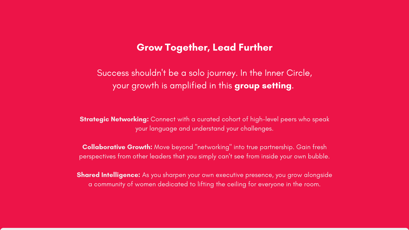 Built for corporate women on the path to C-suite, female founders scaling companies, and high-potential leaders in global leadership pipelines, the Inner Circle offers a strategic space to grow with structure, guidance & accountability.